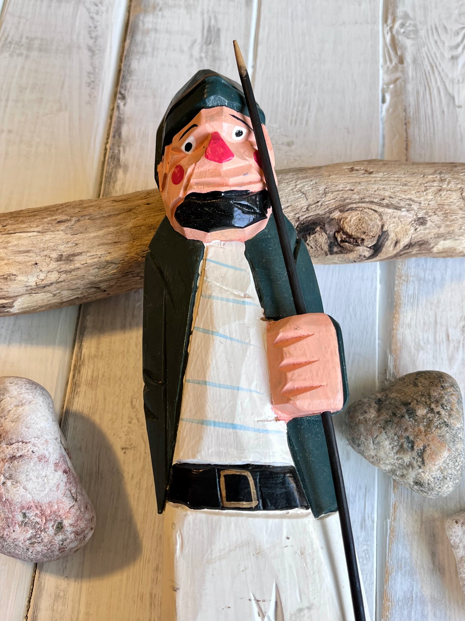 Perry’s ready to leave for a new port. The sea’s a-calling, and he must go. 12” tall with great paint scheme down to his striped shirt. Have spear, will travel. A great addition or start to your Old Salt collection.